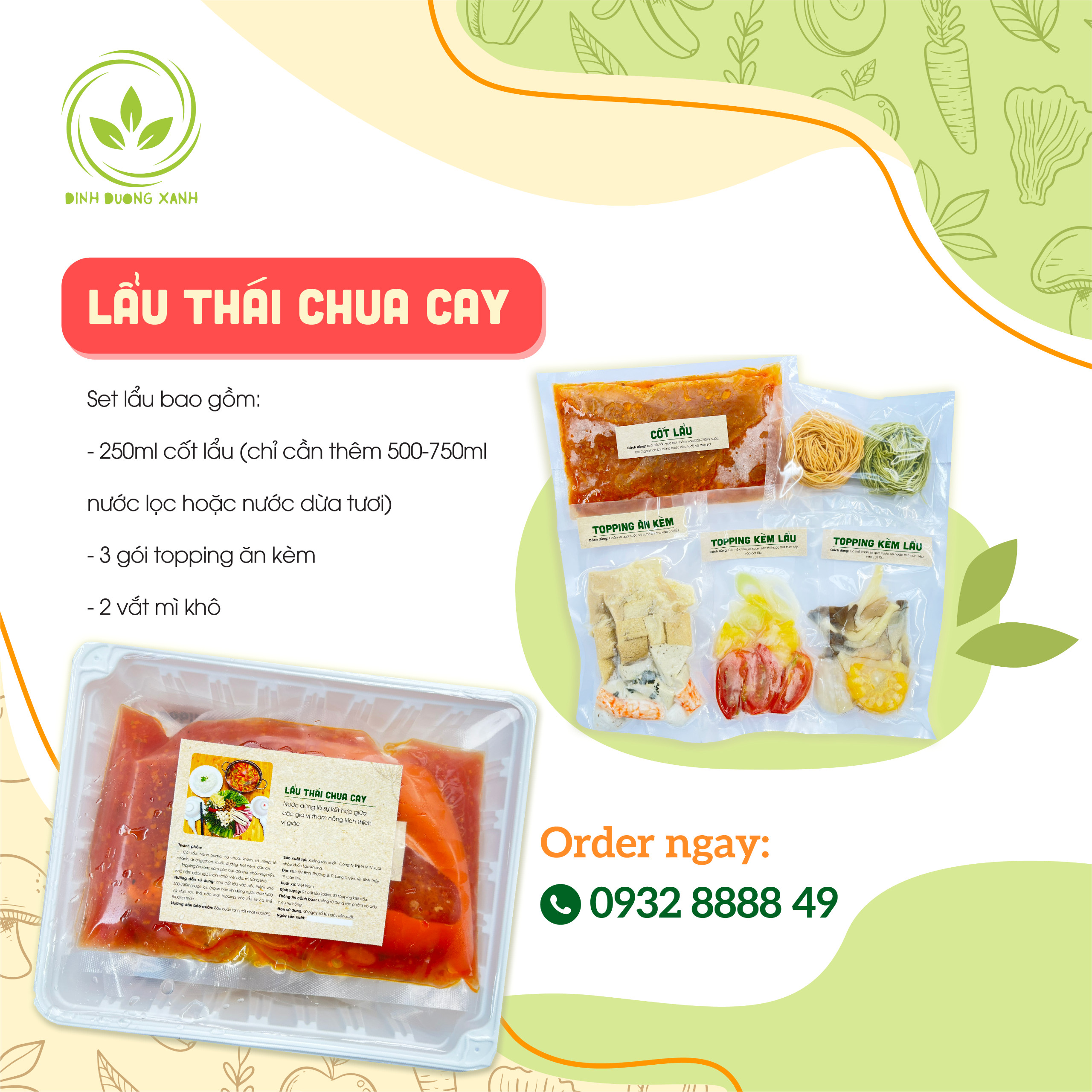 Định lượng: Cốt lẩu 250ml, topping kèm lẩu 300g